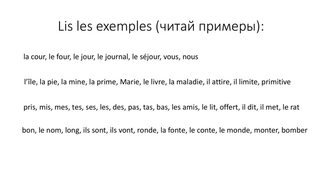 Lis les exemples (читай примеры):la cour, le four, le jour, le journal, le séjour, vous, nous