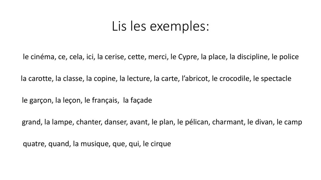 Lis les exemples:le cinéma, ce, cela, ici, la cerise, cette, merci, le Cypre, la place, la discipline, le police