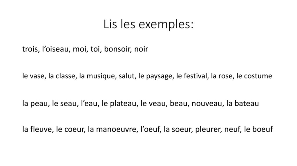 Lis les exemples:trois, l’oiseau, moi, toi, bonsoir, noir
