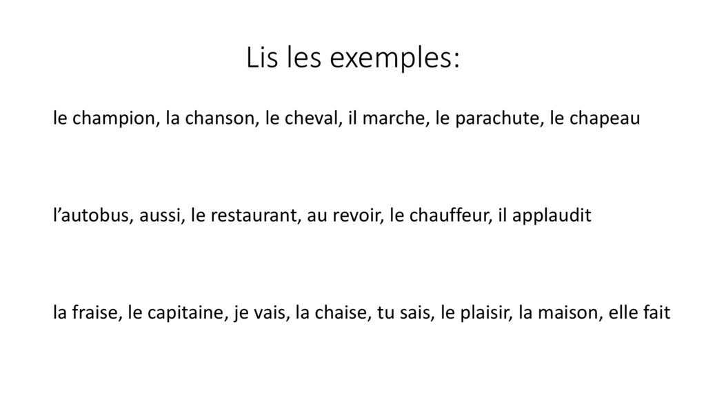 Lis les exemples:le champion, la chanson, le cheval, il marche, le parachute, le chapeau