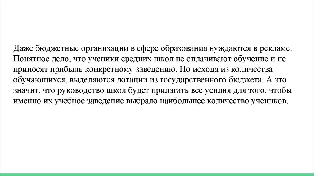 Даже бюджетные организации в сфере образования нуждаются в рекламе.Понятное дело, что ученики средних школ не оплачивают обучение и не