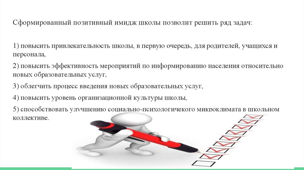 Сформированный позитивный имидж школы позволит решить ряд задач:1) повысить привлекательность школы, в первую очередь, для родителей, учащихся и