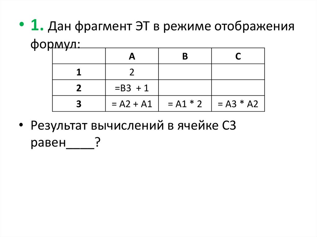 • 1. Дан фрагмент ЭТ в режиме отображенияформул: