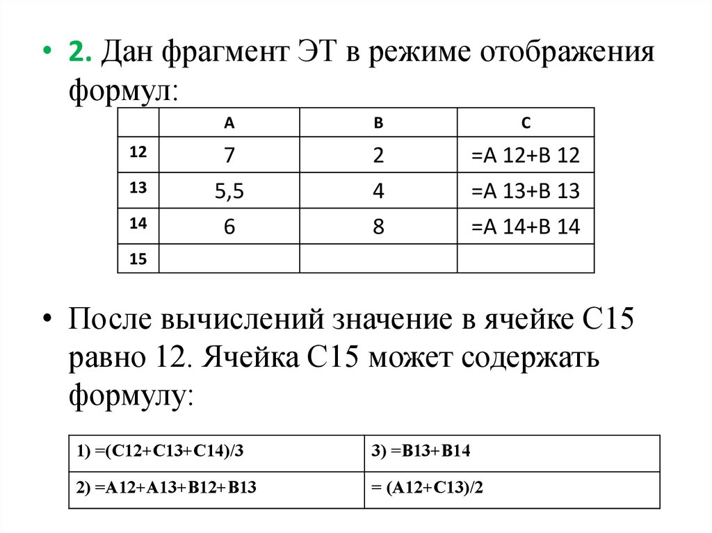 • 2. Дан фрагмент ЭТ в режиме отображенияформул: