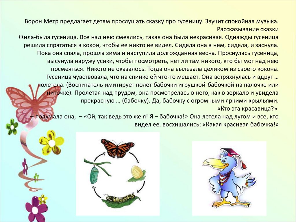Ворон Метр предлагает детям прослушать сказку про гусеницу. Звучит спокойная музыка.Рассказывание сказки