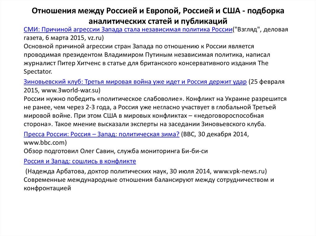 Отношения между Россией и Европой, Россией и США - подборкааналитических статей и публикаций