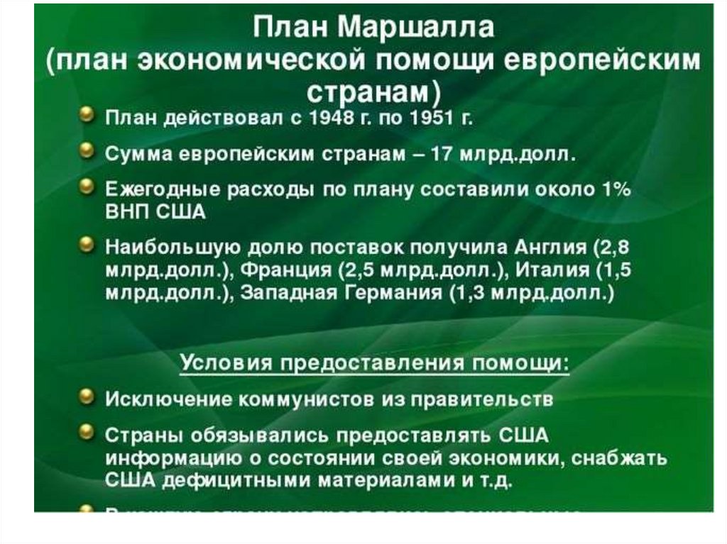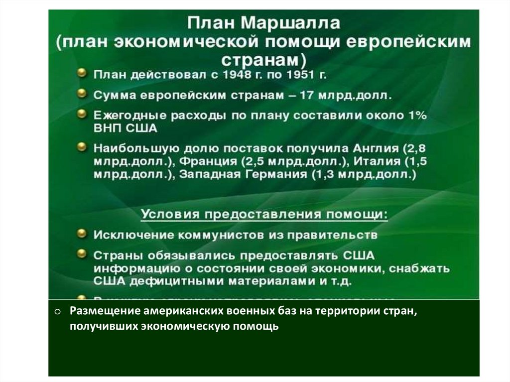 o Размещение американских военных баз на территории стран,получивших экономическую помощь