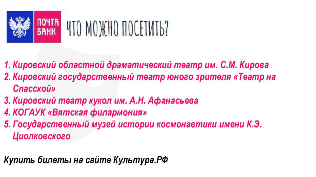 1. Кировский областной драматический театр им. С.М. Кирова2. Кировский государственный театр юного зрителя «Театр на