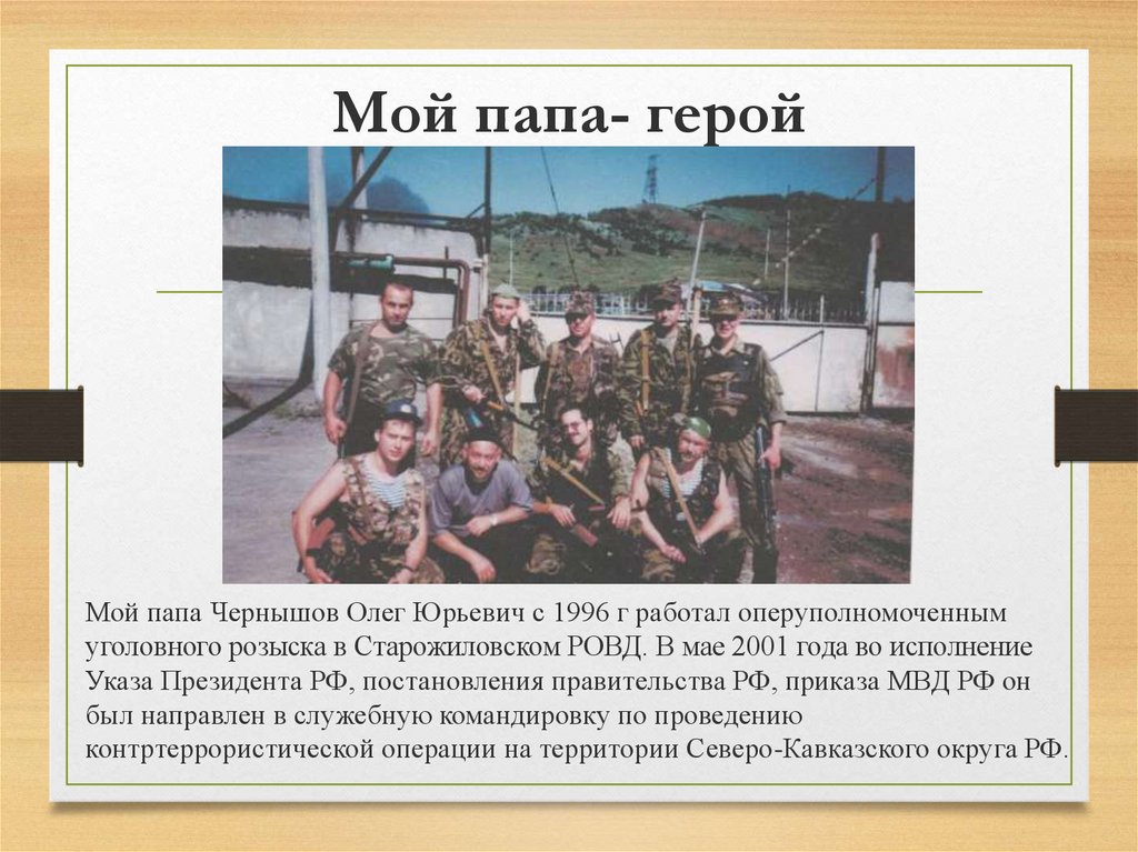 Мой папа- геройМой папа Чернышов Олег Юрьевич с 1996 г работал оперуполномоченным