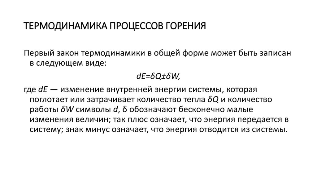 ТЕРМОДИНАМИКА ПРОЦЕССОВ ГОРЕНИЯПервый закон термодинамики в общей форме может быть записан