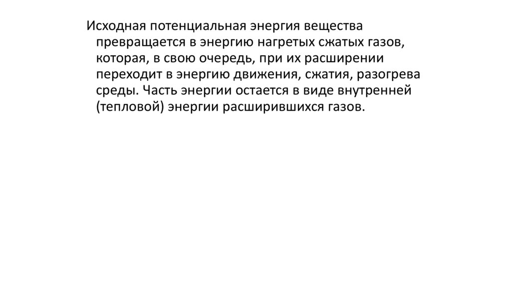 Исходная потенциальная энергия веществапревращается в энергию нагретых сжатых газов,