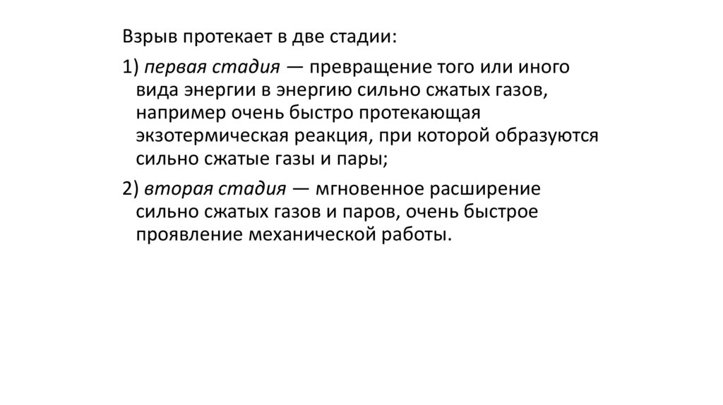 Взрыв протекает в две стадии:1) первая стадия — превращение того или иного