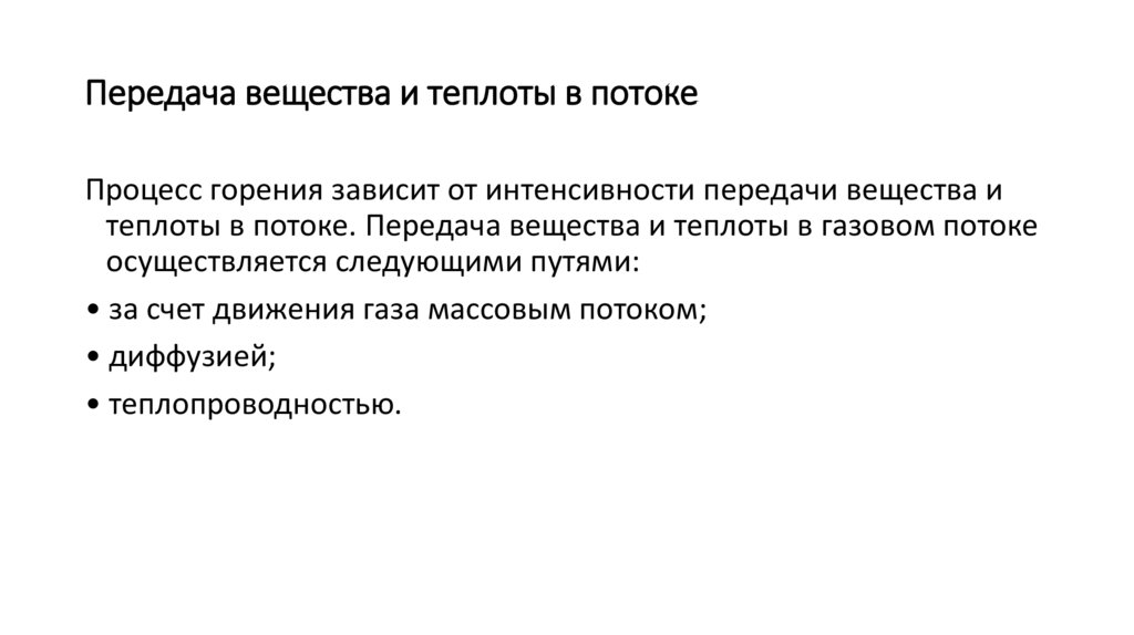 Передача вещества и теплоты в потокеПроцесс горения зависит от интенсивности передачи вещества и
