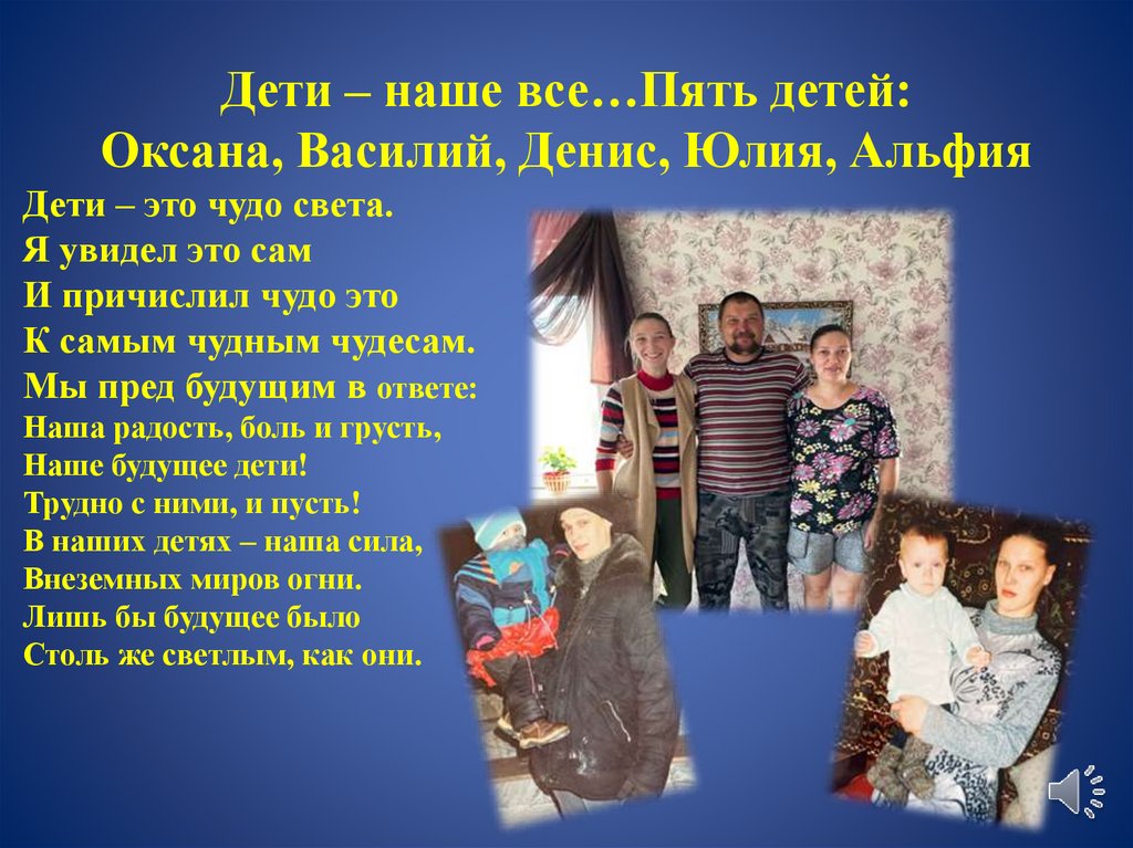 Дети – наше все…Пять детей:Оксана, Василий, Денис, Юлия, Альфия