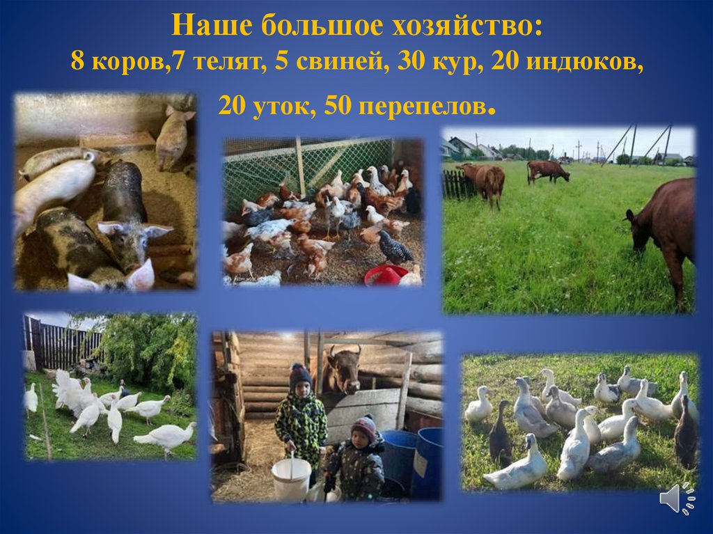 Наше большое хозяйство:8 коров,7 телят, 5 свиней, 30 кур, 20 индюков,