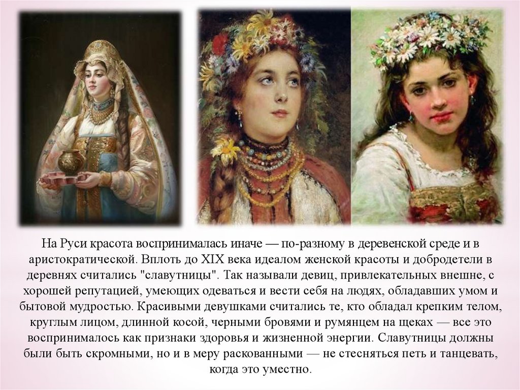 На Руси красота воспринималась иначе — по-разному в деревенской среде и варистократической. Вплоть до XIX века идеалом женской красоты и добродетели в