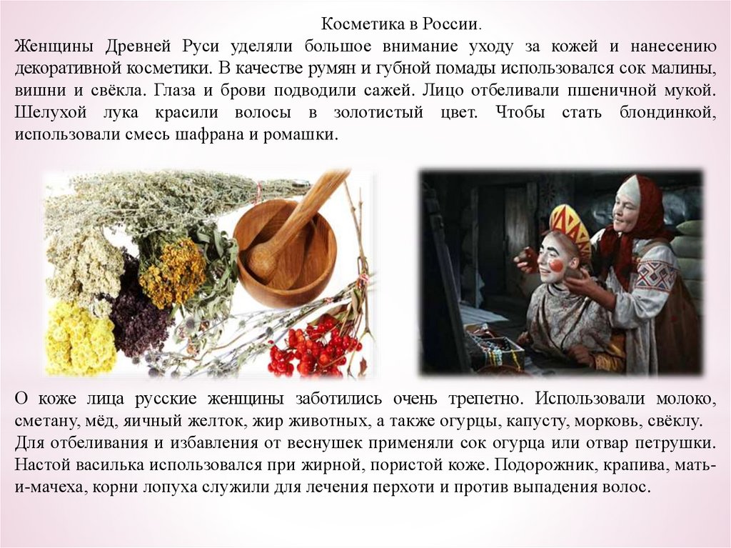 Косметика в России.Женщины Древней Руси уделяли большое внимание уходу за кожей и нанесению