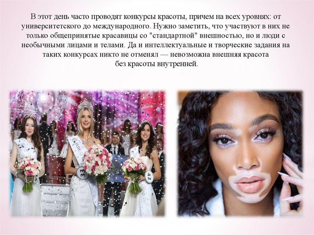 В этот день часто проводят конкурсы красоты, причем на всех уровнях: отуниверситетского до международного. Нужно заметить, что участвуют в них не