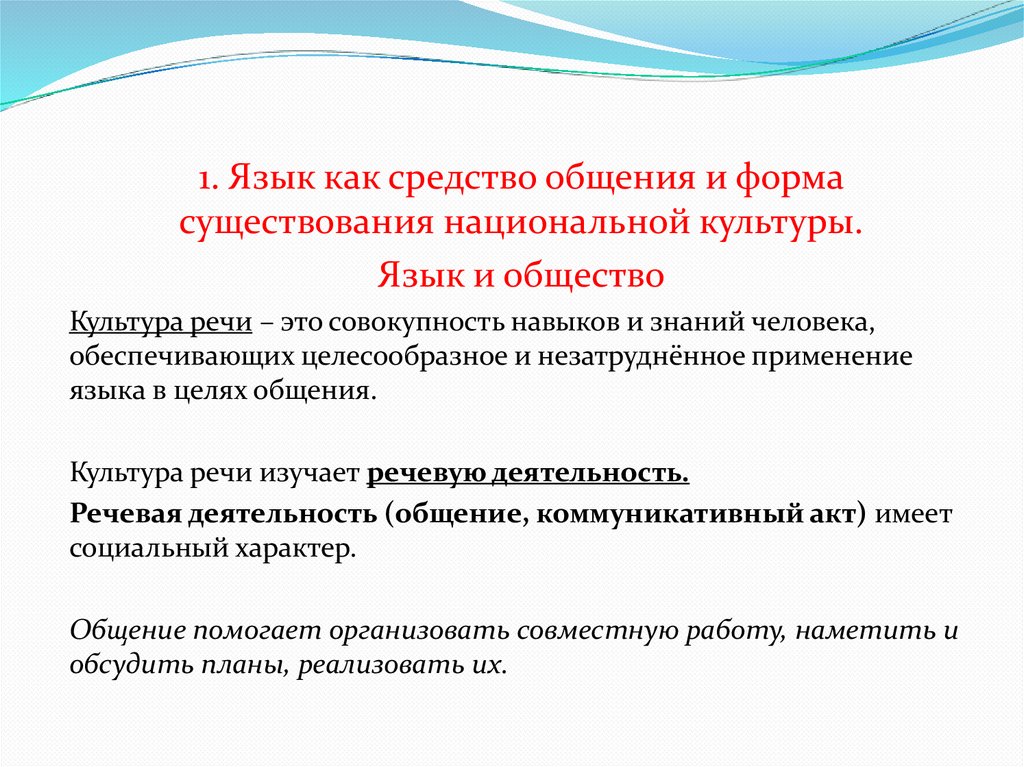 1. Язык как средство общения и формасуществования национальной культуры.