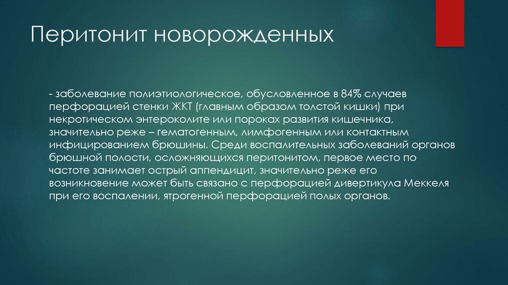 Перитонит новорожденных- заболевание полиэтиологическое, обусловленное в 84% случаев