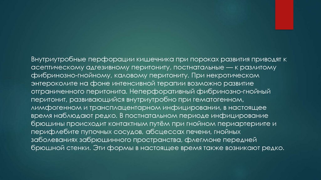 Внутриутробные перфорации кишечника при пороках развития приводят касептическому адгезивному перитониту, постнатальные — к разлитому