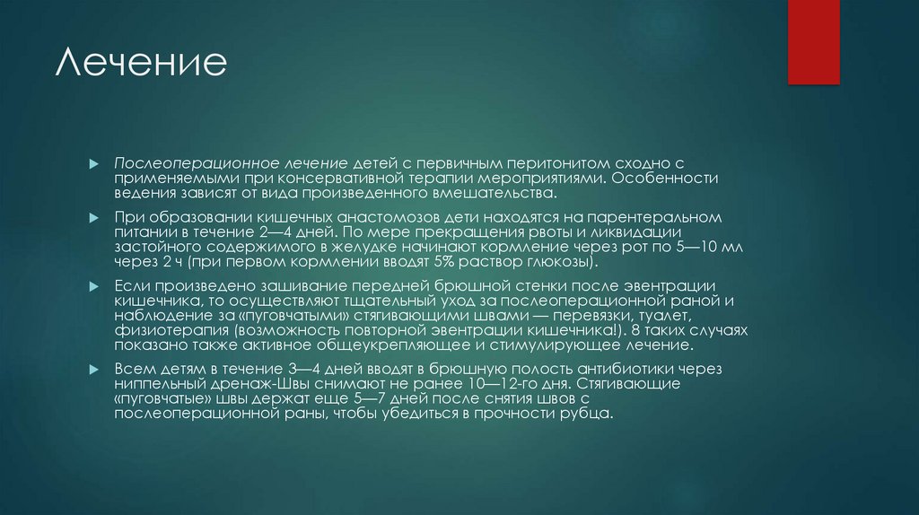 ЛечениеПослеоперационное лечение детей с первичным перитонитом сходно с