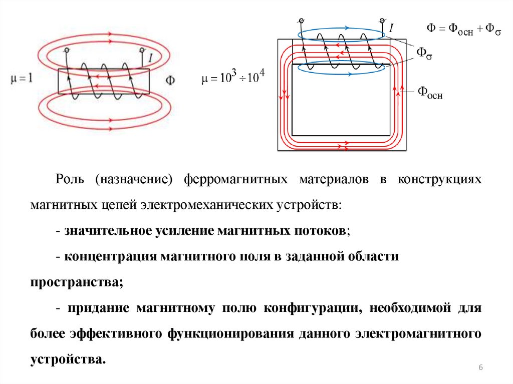 Роль (назначение) ферромагнитных материалов в конструкцияхмагнитных цепей электромеханических устройств: