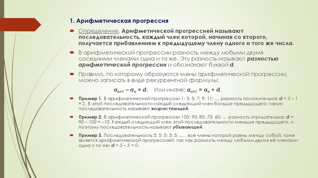 1. Арифметическая прогрессияОпределение. Арифметической прогрессией называют