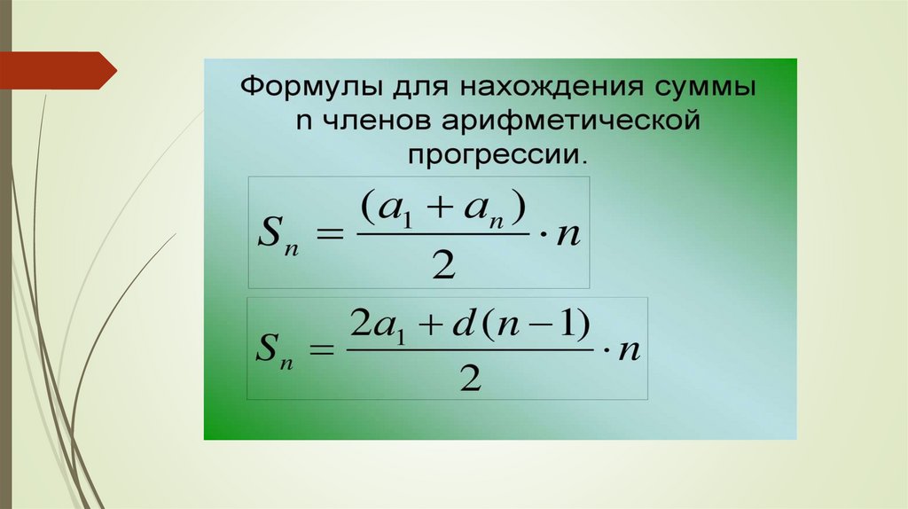 Формула n–го члена арифметической прогрессии (аn), первый членкоторой равен а1 и разность равна d: