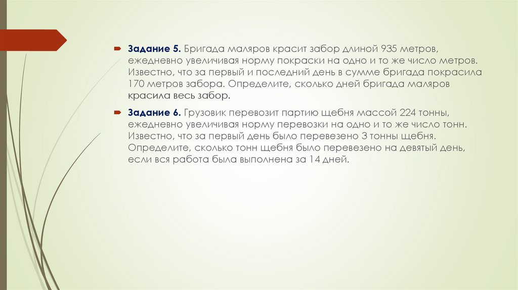 Задание 5. Бригада маляров красит забор длиной 935 метров,ежедневно увеличивая норму покраски на одно и то же число метров.