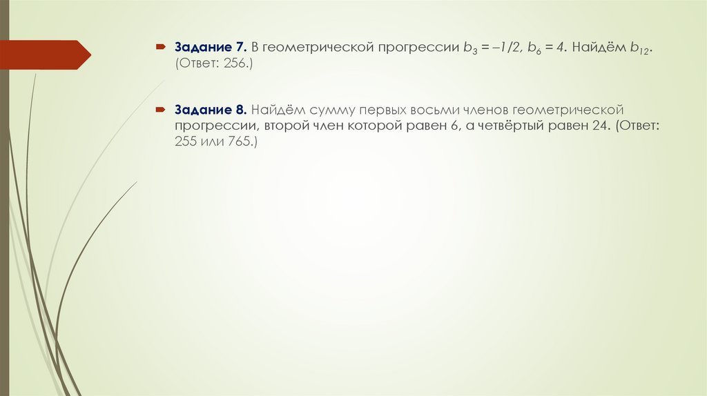 Задание 7. В геометрической прогрессии b3 = –1/2, b6 = 4. Найдём b12.(Ответ: 256.)