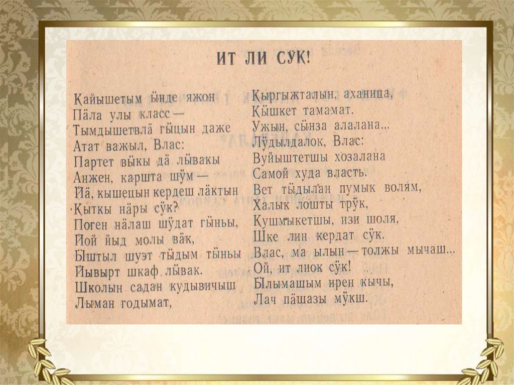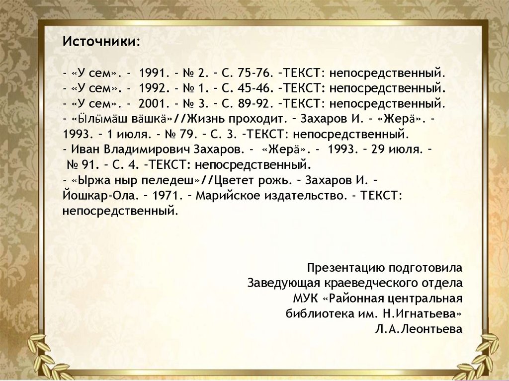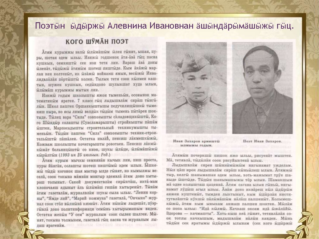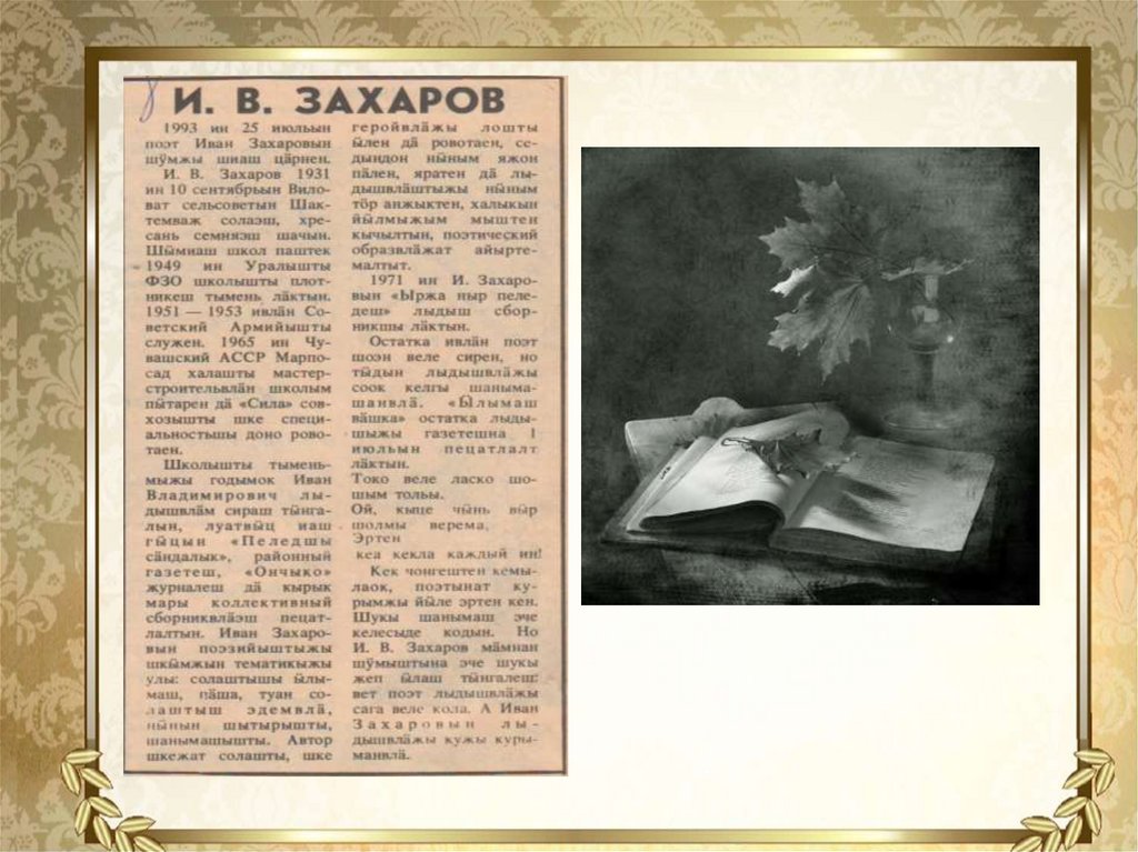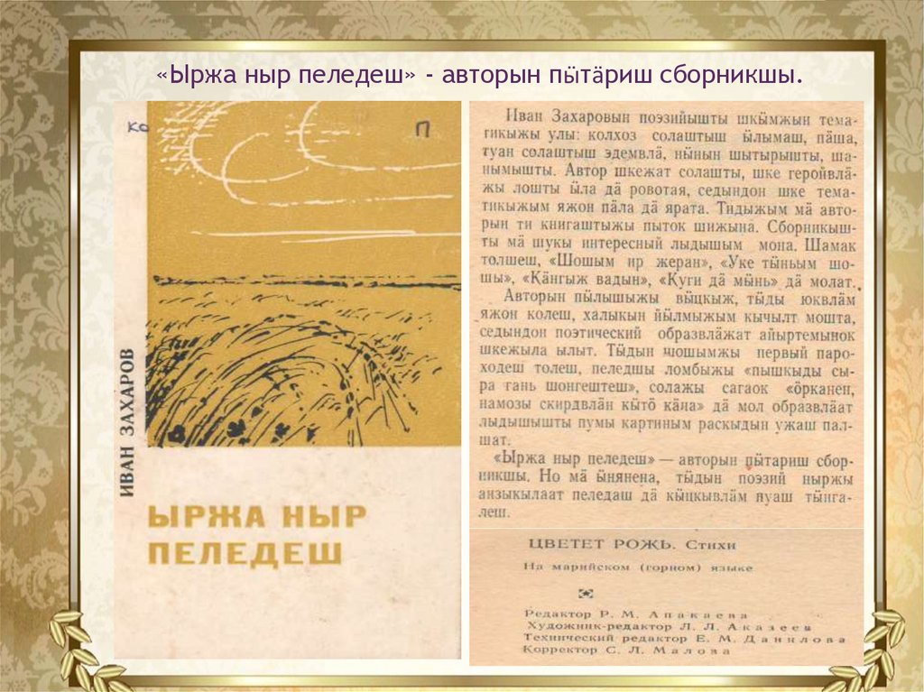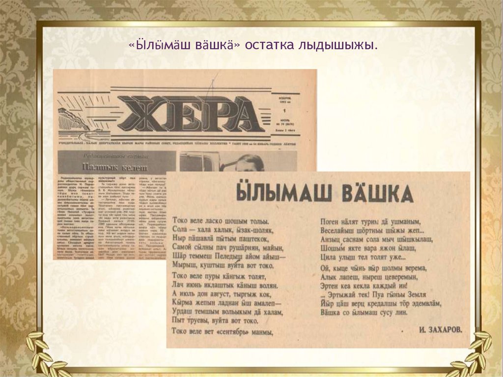 - «Ӹлӹмӓш вӓшкӓ»//Жизнь проходит. – Захаров И. - «Жерӓ». 1993. – 1 июля. - № 79. – С. 3. –ТЕКСТ: непосредственный.