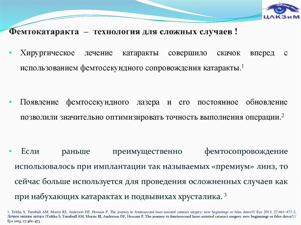 1. Trikha S, Turnbull AM, Morris RJ, Anderson DF, Hossain P. The journey to femtosecond laser-assisted cataract surgery: new beginnings or false dawn?// Eye 2013; 27:461–473 2.