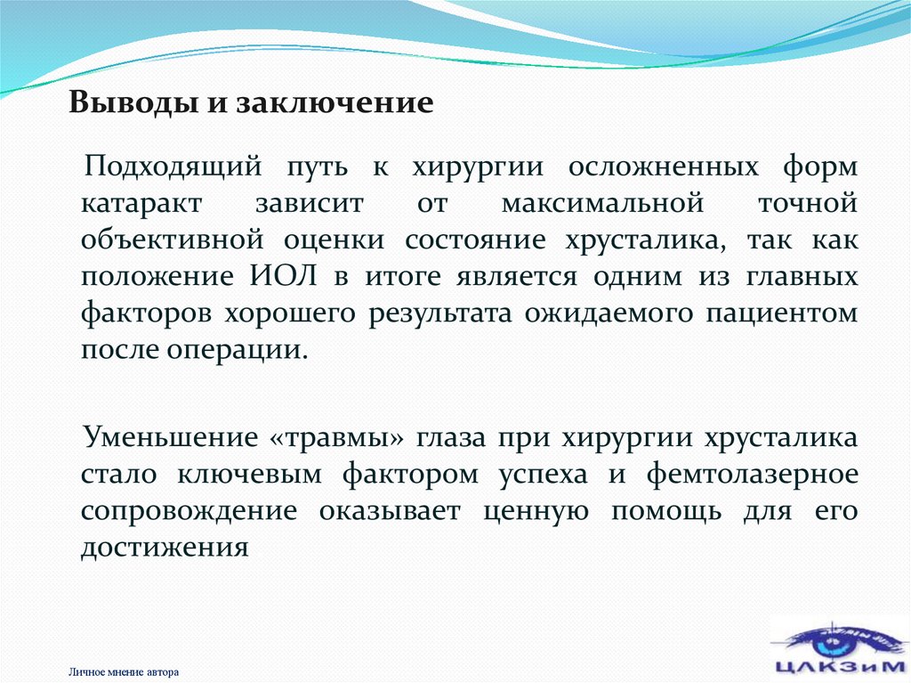 Личное мнение автора 3Trikha S, Turnbull AM, Morris RJ, Anderson DF, Hossain P. The journey to femtosecond laser-assisted cataract surgery: new beginnings or false dawn?//