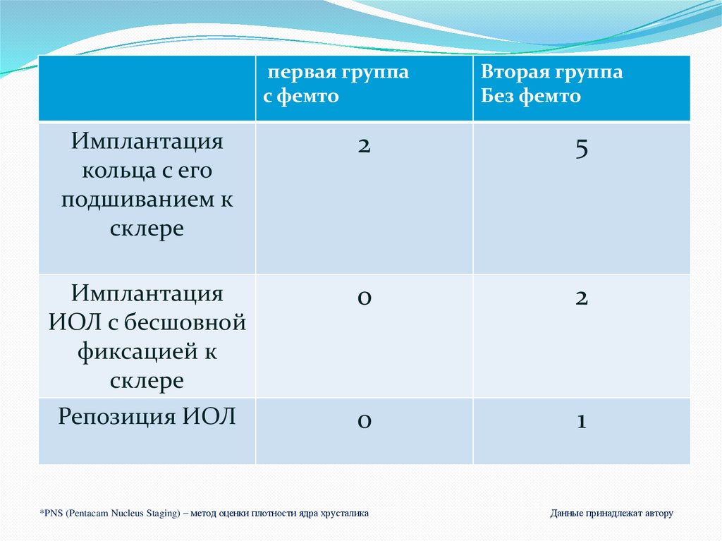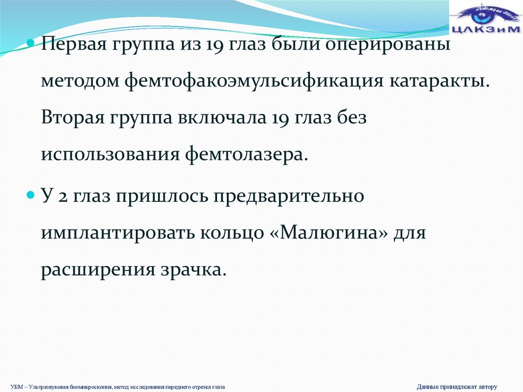 Первая группа из 19 глаз были оперированыметодом фемтофакоэмульсификация катаракты.