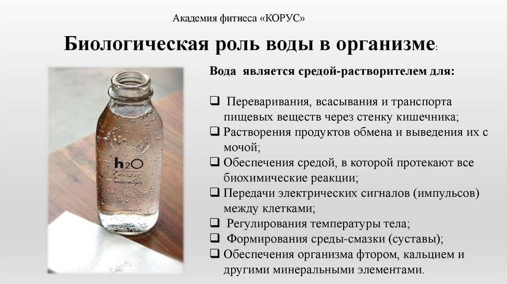 Академия фитнеса «КОРУС»Биологическая роль воды в организме: