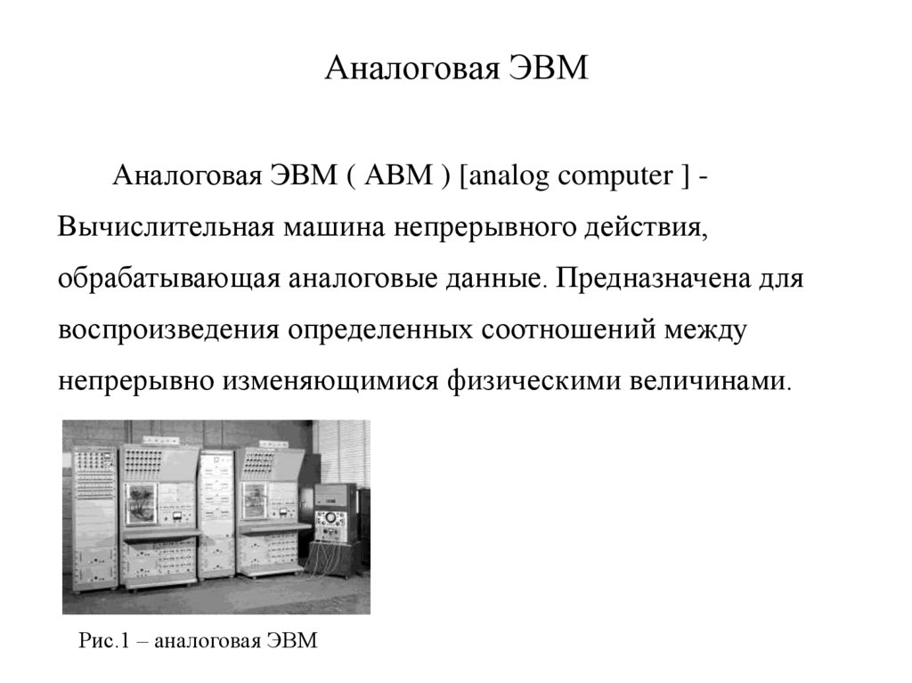 Аналоговая ЭВМАналоговая ЭВМ ( АВМ ) [analog computer ] Вычислительная машина непрерывного действия,
