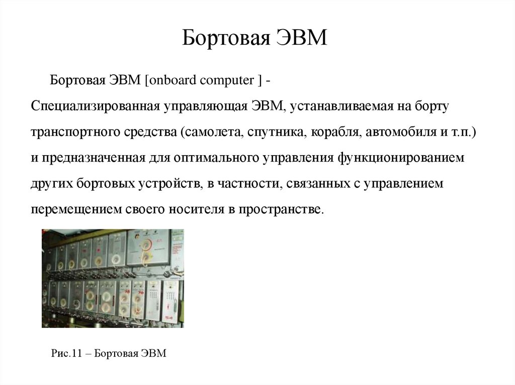 Бортовая ЭВМБортовая ЭВМ [onboard computer ] Специализированная управляющая ЭВМ, устанавливаемая на борту
