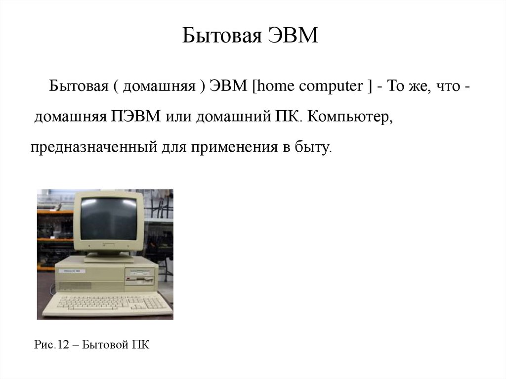 Бытовая ЭВМБытовая ( домашняя ) ЭВМ [home computer ] - То же, что домашняя ПЭВМ или домашний ПК. Компьютер,