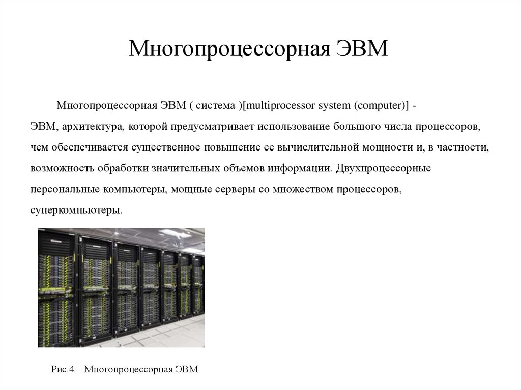 Многопроцессорная ЭВММногопроцессорная ЭВМ ( система )[multiprocessor system (computer)] ЭВМ, архитектура, которой предусматривает использование большого числа процессоров,