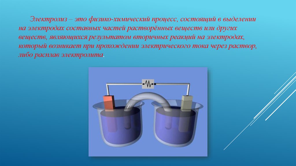 Электролиз – это физико-химический процесс, состоящий в выделениина электродах составных частей растворённых веществ или других