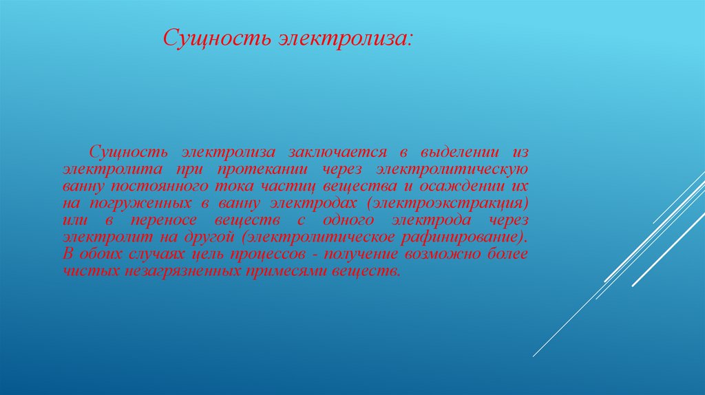 Сущность электролиза:Сущность электролиза заключается в выделении из