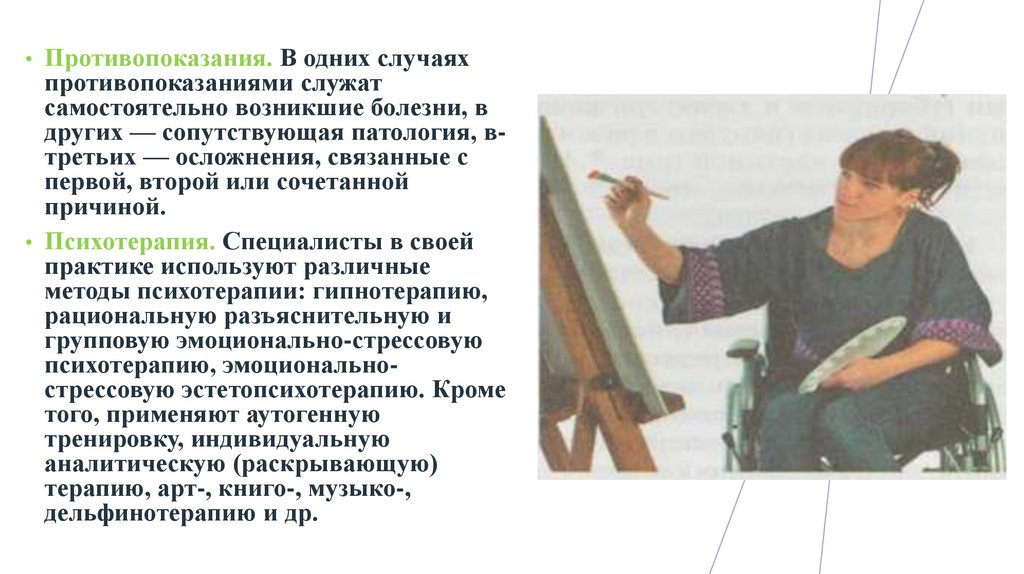 При проведении психотерапии используют методы психокоррекции: аутотренинг,