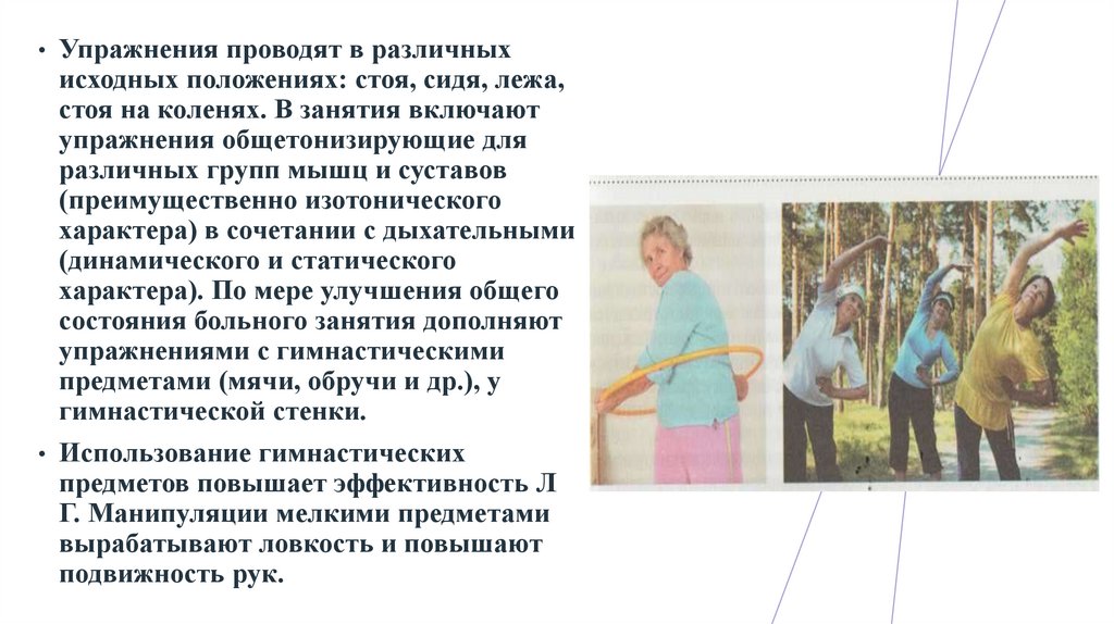 выполняет упражнения в положениях сидя и стоя, добавляют дозированную