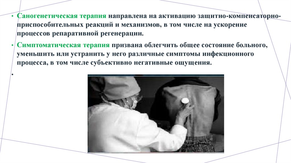 Саногенетическая терапия направлена на активацию защитно-компенсаторноприспособительных реакций и механизмов, в том числе на ускорение