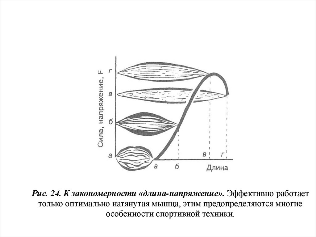 Рис. 24. К закономерности «длина-напряжение». Эффективно работаеттолько оптимально натянутая мышца, этим предопределяются многие