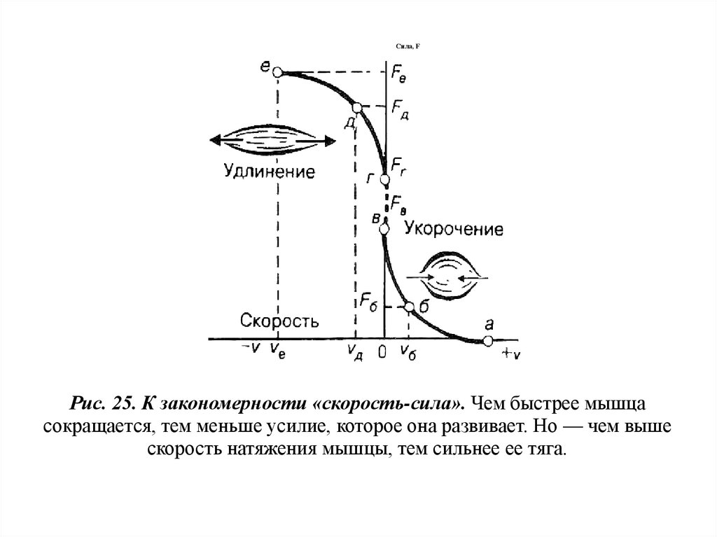 Сила, FРис. 25. К закономерности «скорость-сила». Чем быстрее мышца