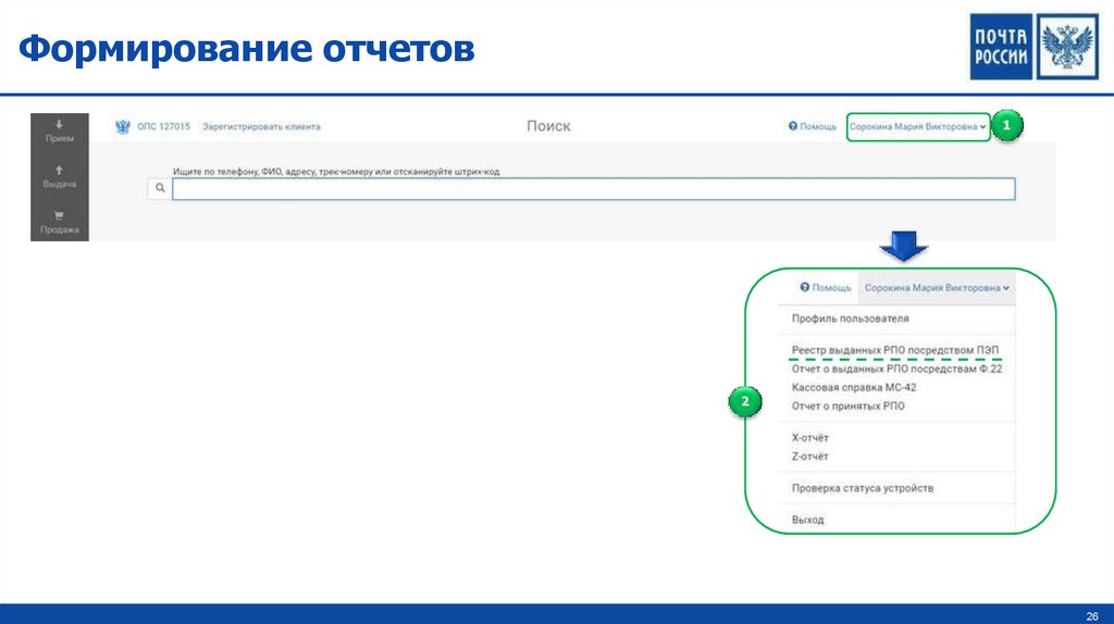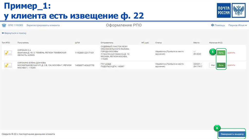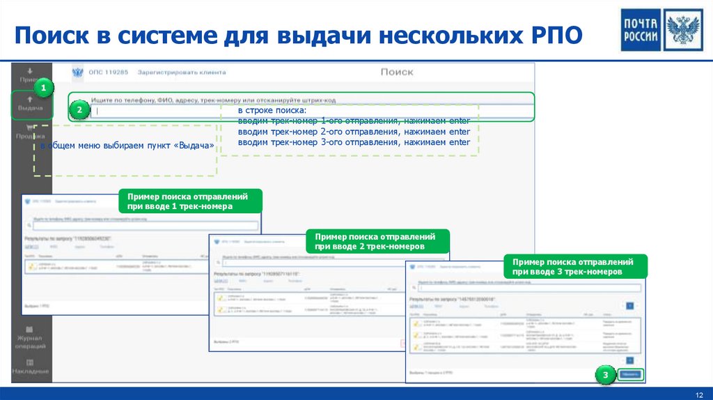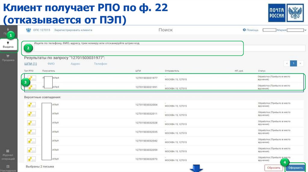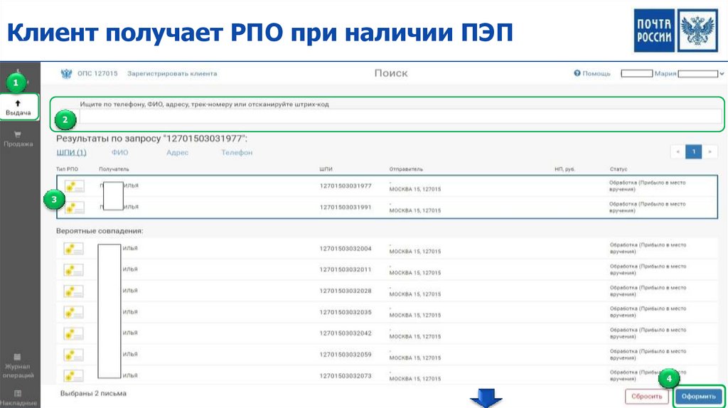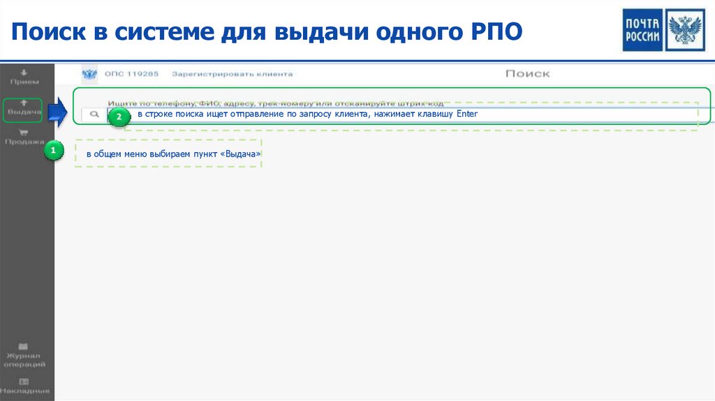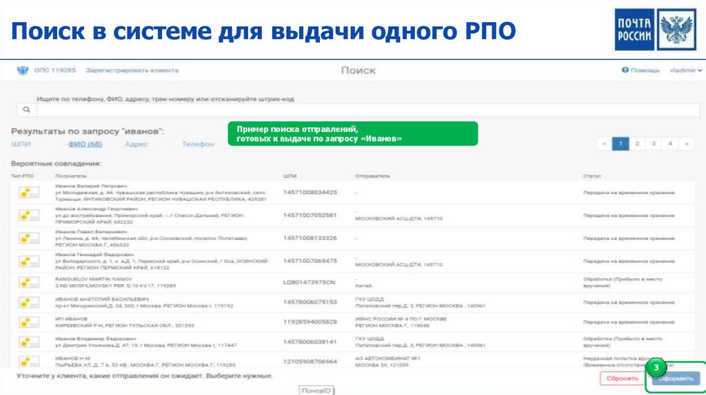 Поиск в системе для выдачи одного РПОПример поиска отправлений,