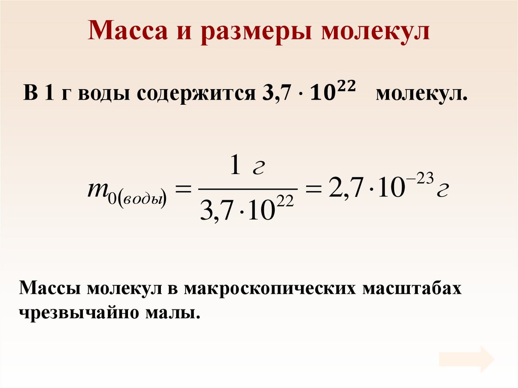 Масса и размеры молекулВ 1 г воды содержится 3,7 ∙
