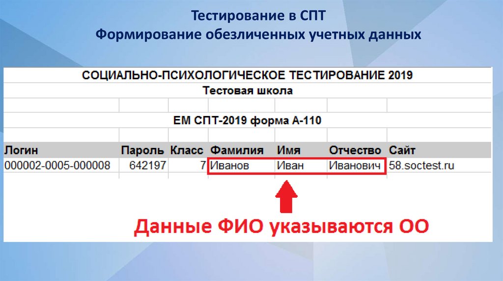Тестирование в СПТФормирование обезличенных учетных данных